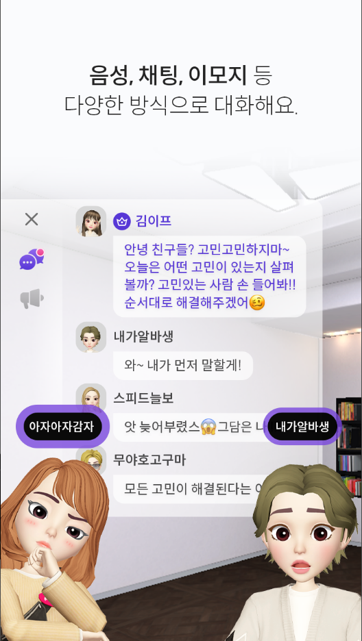 음성, 채팅, 이모지 등 다양한 방식으로 대화해요.