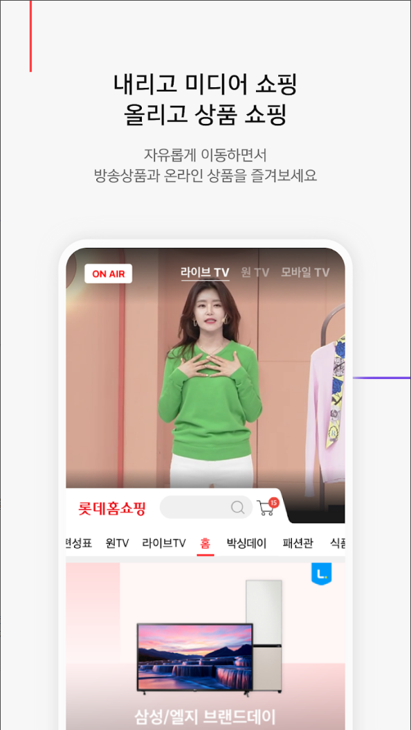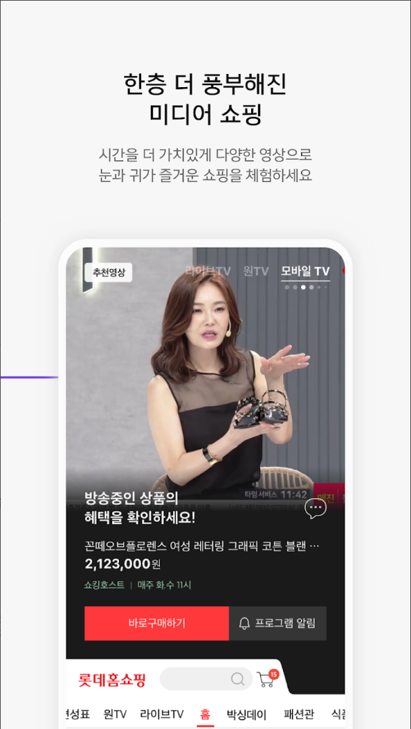 롯데홈쇼핑(Lotte Homeshopping)은 대표적인 패션 전문관과 미디어 쇼핑 등의 상품 쇼핑을 더 몰입도 있게 즐겨볼 수 있도록 롯데홈쇼핑만의 차별화된 LIVE TV, ONE TV, 모바일 TV 방송을 더 편하게 시청하고, 기분 좋게 쇼핑할 수 있도록 구성되어 있습니다.