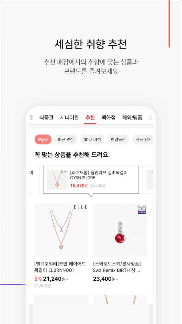 또, 세심한 취향 추천을 확인하실 수 있도록 갖추고 있어 추천 매장에서 취향에 맞는 상품과 브랜드를 그리고 최근 본 상품 뿐 아니라, 나와 비슷한 고객들의 관심 상품까지 함께 추천해드립니다.
