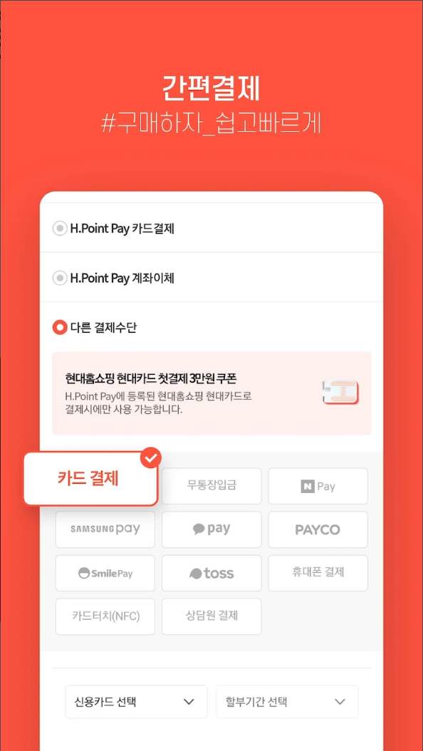 또한 다양하고 편리한 결제를 갖추고 있어, 페이코/삼성페이/카카오페이/카드터치(NFC)는 물론, 다양한 신용카드 청구할인까지 나에게 맞는 결제를 선택하실 수 있습니다.