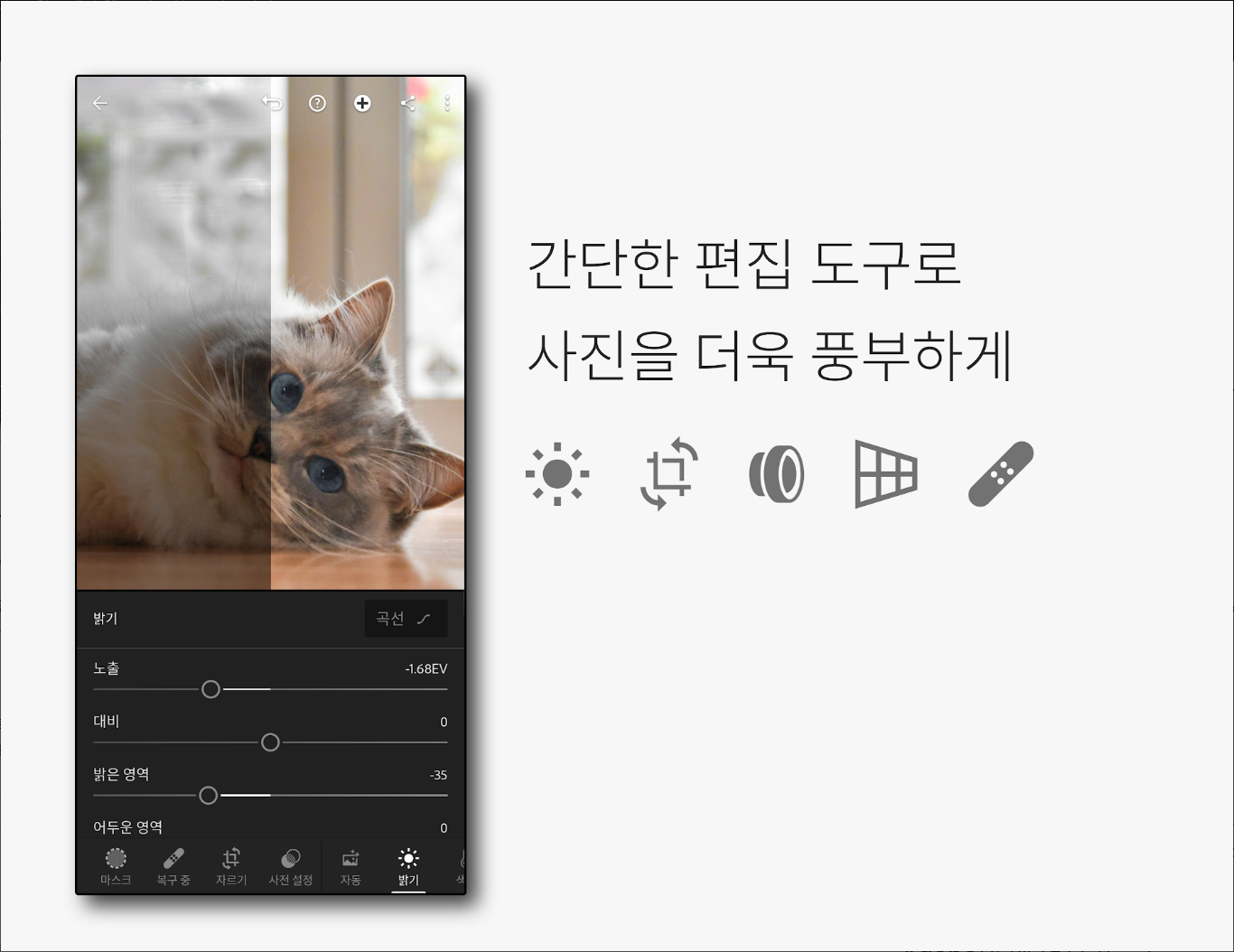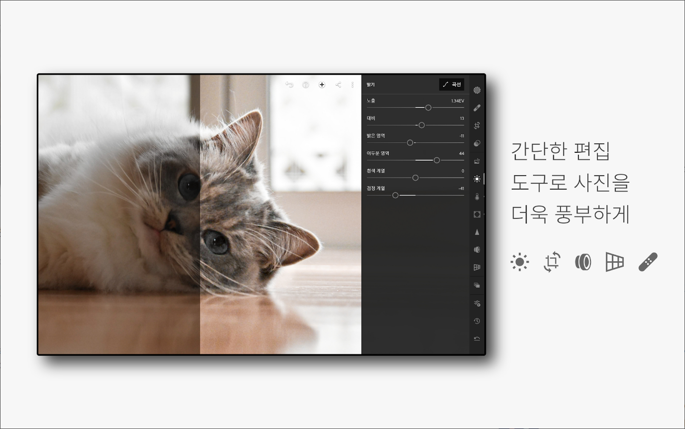 • 정교한 슬라이더를 사용하여 대비, 노출, 밝은 영역, 어두운 영역 등 밝기 조절 및 화질 개선
