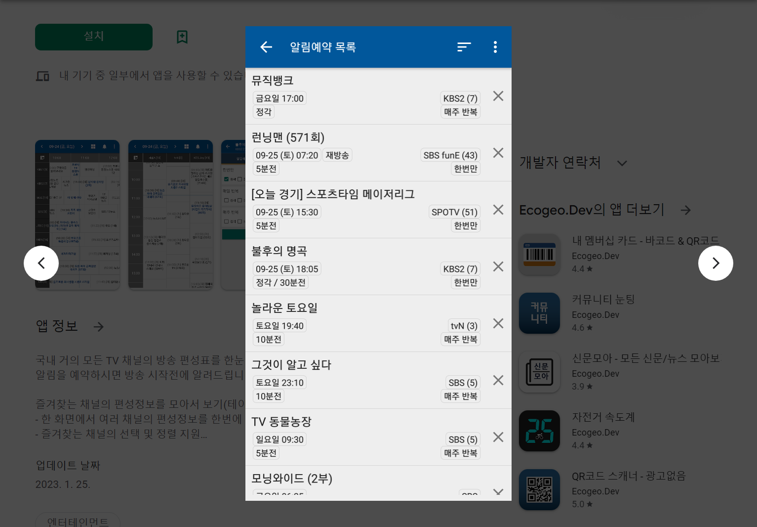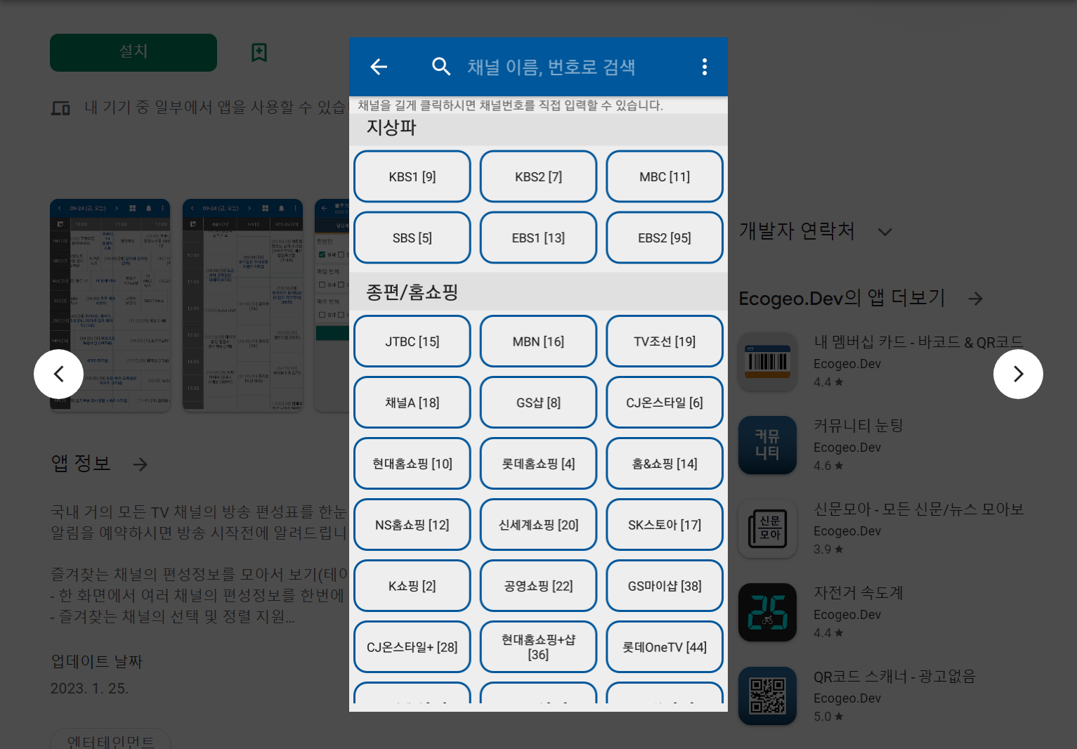 전체 채널 목록을 확인하고 채널 검색이 가능하며, 방송 서비스 제공자 선택시 채널 번호 자동 입력 기능이 있고, 방송 알림 예약 기능을 제공하며, 알림 반복 유형, 알림 시각, 진동/소리 상세 설정 등이 가능합니다. 또, 프로그램 정보 검색, 프로그램 제목 글자 크기 변경, 시스템 다크 모드 지원 등의 기능을 제공하며, 지상파, 종편, 케이블 등 다양한 채널을 제공합니다.