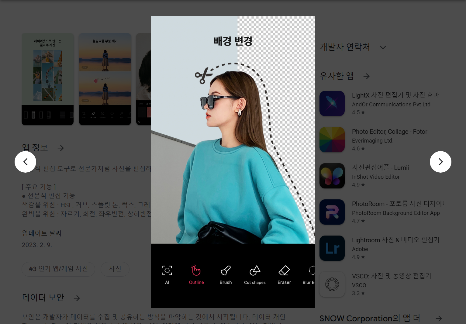 배경제거, 부분 지우개, 부분 조정, 패치, 조명, 모자이크, 일괄 편집, 레이아웃, 콜라주, 화질 개선
